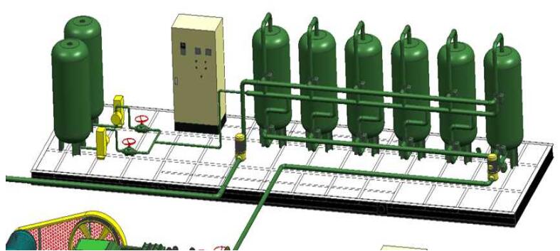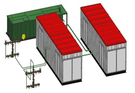 2、含油污水处理罐撬块 含油污水处理罐撬块主要由提升泵、含油污水处理罐、加药装置、PLC控制柜以及管汇阀门等组成。
